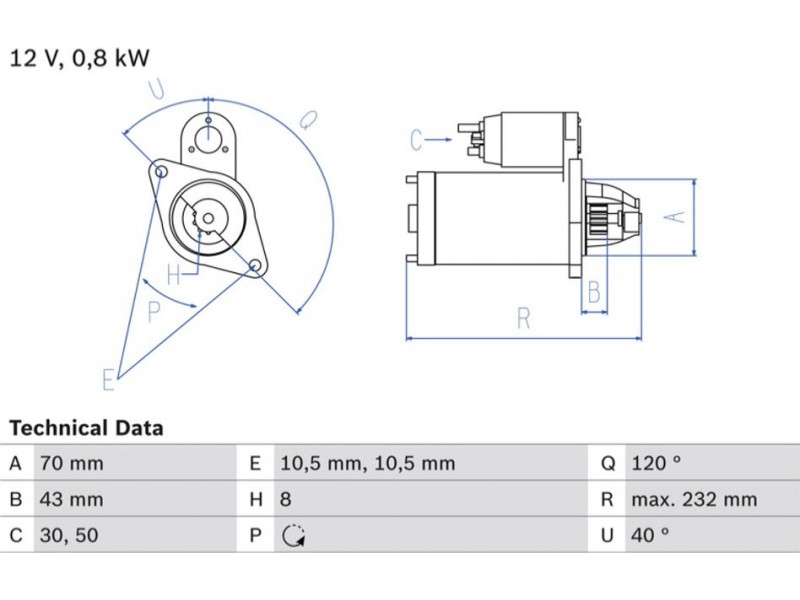 Criteries : Αριθμός δοντιών 8, Αρχική θέση γραναζιού [mm] 43, Γωνία Οπή στερέωσης [μοίρες] 40, Γωνία στήριξης [μοίρες] 40, Γωνία Στόμιο [μοίρες] 120, Διάμετρος οπής 2 [mm] 10,5, Διάμετρος οπής [mm] 10,5, Διάμετρος φλάντζας [mm] 70, Επαφή 30, Επαφή 50, Θέση/βαθμοί links, Ισχύς μίζας [kW] 0,8, Μήκος [mm] 232, Παλαιό εξάρτημα , Παραλλαγή μίζας αυτοέδραση, Πλήθος οπών με βόλτα 0, Πλήθος των οπών στερέωσης 2, Τάση [V] 12, Φορά περιστροφής Φορά περιστρ. αντίθετα προς τη φορά των δεικτών του ρολογιού