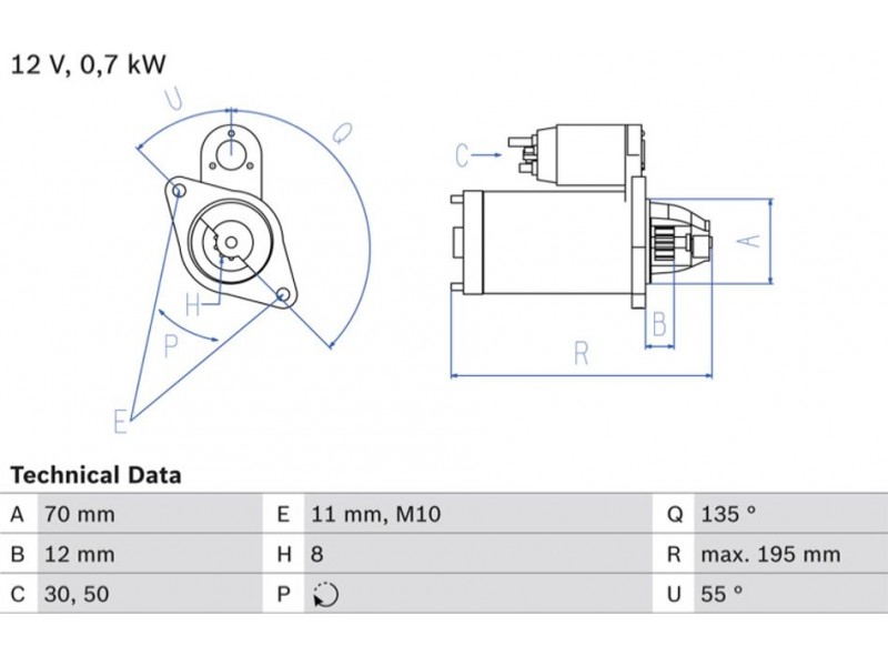Criteries : Αριθμός δοντιών 8, Αρχική θέση γραναζιού [mm] 12, Γωνία Οπή στερέωσης [μοίρες] 55, Γωνία στήριξης [μοίρες] 55, Γωνία Στόμιο [μοίρες] 135, Διάμετρος οπής 2 [mm] 11, Διάμετρος φλάντζας [mm] 70, Διαστάσεις σπειρώματος M10x1.5, Επαφή 30,50, Θέση/βαθμοί links, Ισχύς μίζας [kW] 0,7, Μήκος [mm] 195, Παλαιό εξάρτημα , Παραλλαγή μίζας αυτοέδραση, Πλήθος οπών με βόλτα 1, Πλήθος των οπών στερέωσης 1, Τάση [V] 12, Φορά περιστροφής Φορά περιστροφής προς τα δεξιά