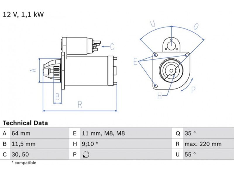 Criteries : Αριθμός δοντιών 10, Αριθμός δοντιών 9, Αρχική θέση γραναζιού [mm] 11,5, Γωνία Οπή στερέωσης [μοίρες] 55, Γωνία στήριξης [μοίρες] 55, Γωνία Στόμιο [μοίρες] 35, Διάμετρος οπής [mm] 11, Διάμετρος φλάντζας [mm] 66, Διαστάσεις σπειρώματος 1 M8x1.25, Διαστάσεις σπειρώματος 2 M8x1.25, Επαφή 30,50, Θέση/βαθμοί links, Ισχύς μίζας [kW] 1,1, Μήκος [mm] 220, Παλαιό εξάρτημα , Παραλλαγή μίζας αυτοέδραση, Πλήθος οπών με βόλτα 2, Πλήθος των οπών στερέωσης 1, Τάση [V] 12, Φορά περιστροφής Φορά περιστροφής προς τα δεξιά