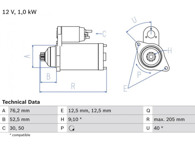 Criteries : Αριθμός δοντιών 10, Αριθμός δοντιών 9, Αρχική θέση γραναζιού [mm] 52,5, Γωνία Οπή στερέωσης [μοίρες] 40, Γωνία στήριξης [μοίρες] 40, Διάμετρος οπής 2 [mm] 12,5, Διάμετρος οπής [mm] 12,5, Διάμετρος φλάντζας [mm] 76,2, Επαφή 30, Επαφή 50, Θέση/βαθμοί links, Ισχύς μίζας [kW] 1, Μήκος [mm] 205, Παλαιό εξάρτημα , Παραλλαγή μίζας ελεύθερο, Πλήθος οπών με βόλτα 0, Πλήθος των οπών στερέωσης 2, Τάση [V] 12, Φορά περιστροφής Φορά περιστρ. αντίθετα προς τη φορά των δεικτών του ρολογιού