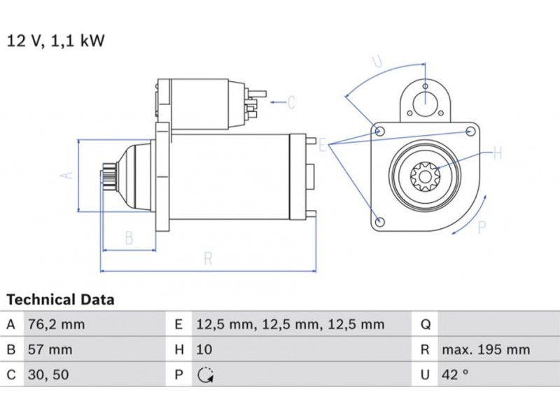 Criteries : Αριθμός δοντιών 10, Αρχική θέση γραναζιού [mm] 57, Γωνία Οπή στερέωσης [μοίρες] 42, Γωνία στήριξης [μοίρες] 42, Διάμετρος οπής 2 [mm] 12,5, Διαμέτρος οπής 3 [mm] 12,5, Διάμετρος οπής [mm] 12,5, Διάμετρος φλάντζας [mm] 76,2, Επαφή 30, Επαφή 50, Θέση/βαθμοί links, Ισχύς μίζας [kW] 1,1, Μήκος [mm] 195, Παλαιό εξάρτημα , Παραλλαγή μίζας ελεύθερο, Πλήθος οπών με βόλτα 0, Πλήθος των οπών στερέωσης 3, Τάση [V] 12, Φορά περιστροφής Φορά περιστρ. αντίθετα προς τη φορά των δεικτών του ρολογιού