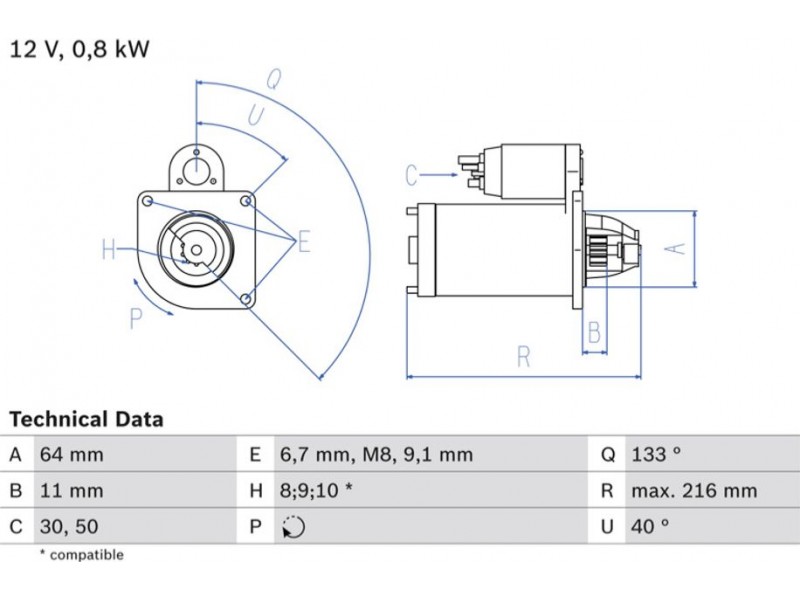 Criteries : Αριθμός δοντιών 10, Αριθμός δοντιών 8, Αριθμός δοντιών 9, Αρχική θέση γραναζιού [mm] 11, Γωνία Οπή στερέωσης [μοίρες] 40, Γωνία στήριξης [μοίρες] 40, Γωνία Στόμιο [μοίρες] 133, Διαμέτρος οπής 3 [mm] 9,1, Διάμετρος οπής [mm] 6,7, Διάμετρος φλάντζας [mm] 64, Διαστάσεις σπειρώματος 1 M8x1.25, Επαφή 30, Επαφή 50, Θέση/βαθμοί rechts, Ισχύς μίζας [kW] 0,8, Μήκος [mm] 216, Παλαιό εξάρτημα , Παραλλαγή μίζας αυτοέδραση, Πλήθος οπών με βόλτα 1, Πλήθος των οπών στερέωσης 2, Τάση [V] 12, Φορά περιστροφής Φορά περιστροφής προς τα δεξιά