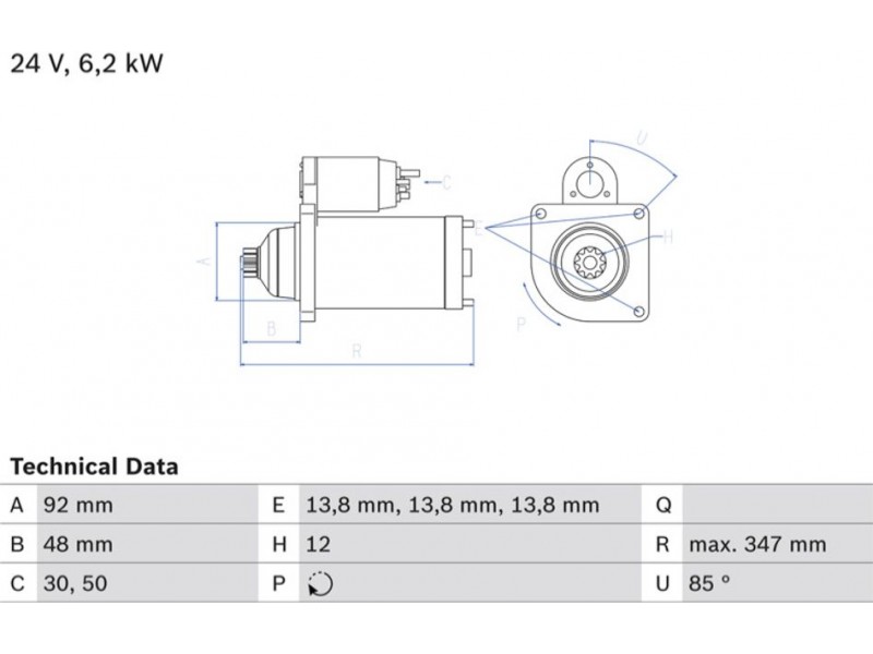 Criteries : Αριθμός δοντιών 12, Αρχική θέση γραναζιού [mm] 48, Γωνία Οπή στερέωσης [μοίρες] 85, Γωνία στήριξης [μοίρες] 85, Διάμετρος οπής 2 [mm] 13,8, Διαμέτρος οπής 3 [mm] 13,8, Διάμετρος οπής [mm] 13,8, Διάμετρος φλάντζας [mm] 92, Επαφή 30,50, Θέση/βαθμοί rechts, Ισχύς μίζας [kW] 6,2, Μήκος [mm] 347, Παλαιό εξάρτημα , Παραλλαγή μίζας ελεύθερο, Πλήθος οπών με βόλτα 0, Πλήθος των οπών στερέωσης 3, Τάση [V] 24, Φορά περιστροφής Φορά περιστροφής προς τα δεξιά