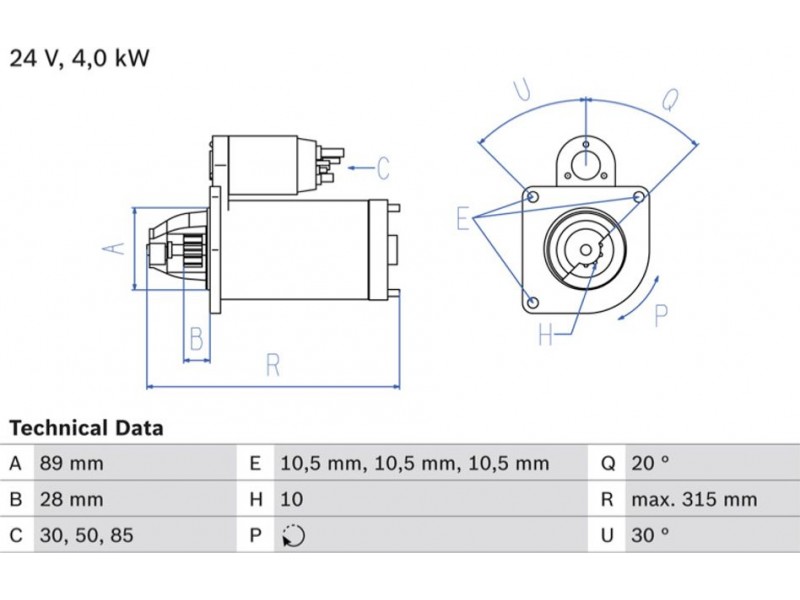 Criteries : Αριθμός δοντιών 10, Αρχική θέση γραναζιού [mm] 28, Γωνία Οπή στερέωσης [μοίρες] 30, Γωνία στήριξης [μοίρες] 30, Γωνία Στόμιο [μοίρες] 20, Διάμετρος οπής 2 [mm] 10,5, Διαμέτρος οπής 3 [mm] 10,5, Διάμετρος οπής [mm] 10,5, Διάμετρος φλάντζας [mm] 89, Επαφή 30, Επαφή 50, Επαφή 85, Θέση/βαθμοί links, Ισχύς μίζας [kW] 4, Μήκος [mm] 315, Παλαιό εξάρτημα , Παραλλαγή μίζας αυτοέδραση, Πλήθος οπών με βόλτα 0, Πλήθος των οπών στερέωσης 3, Τάση [V] 24, Φορά περιστροφής Φορά περιστροφής προς τα δεξιά