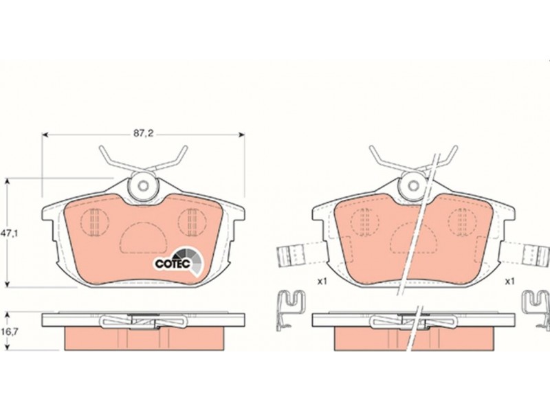 Criteries : Επαφή προειδοποίησης φθοράς με ηχητική προειδοποίηση φθοράς, Πάχος [mm] 16,7, Περιορισμός κατασκευαστή TRW, Πλάτος [mm] 87,2, Στοιχεία ελέγχου E9 90R-01708/009, Συμπληρωματικό προϊόν / συμπληρωματική πληροφορία με αξεσουάρ, Συμπληρωματικό προϊόν/ πληροφορίες 2 με βίδες δαγκάνας φρένων, Υψος [mm] 47,1
