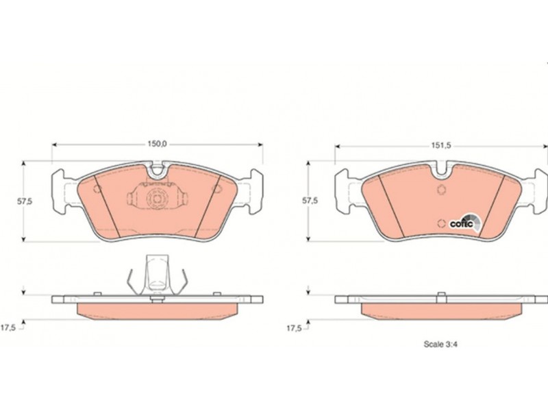 Criteries : Επαφή προειδοποίησης φθοράς προετοιμασμένο για προειδοποιητική ένδειξη φθοράς, Μήκος 1 [mm] 151,5, Μήκος 2 [mm] 150, Πάχος [mm] 17,5, Περιορισμός κατασκευαστή ATE, Στοιχεία ελέγχου E9 90R 01705/047, Υψος [mm] 57,5