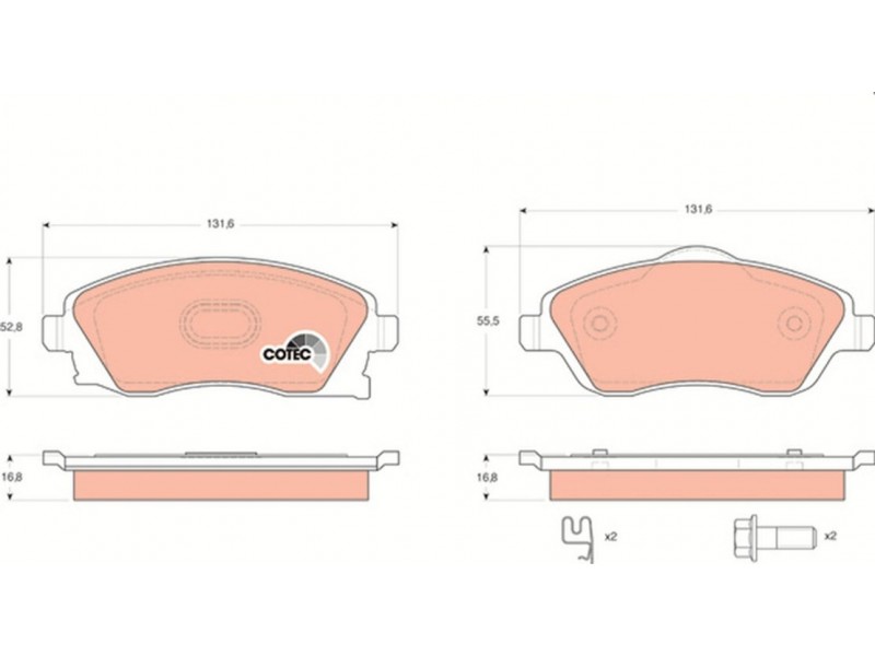 Criteries : Επαφή προειδοποίησης φθοράς με ηχητική προειδοποίηση φθοράς, Πάχος [mm] 16,8, Περιορισμός κατασκευαστή TRW, Πλάτος [mm] 131,6, Στοιχεία ελέγχου E9 90R - 01107/242, Συμπληρωματικό προϊόν / συμπληρωματική πληροφορία με αξεσουάρ, Συμπληρωματικό προϊόν/ πληροφορίες 2 με βίδες δαγκάνας φρένων, Ύψος 1 [mm] 52,8, Ύψος 2 [mm] 55,5