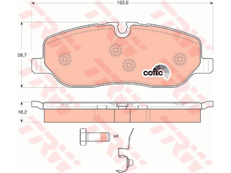 Criteries : Επαφή προειδοποίησης φθοράς προετοιμασμένο για προειδοποιητική ένδειξη φθοράς, Πάχος [mm] 18,2, Περιορισμός κατασκευαστή TRW, Πλάτος [mm] 162,6, Στοιχεία ελέγχου E9 90R - 01107/1239, Συμπληρωματικό προϊόν / συμπληρωματική πληροφορία με αξεσουάρ, Συμπληρωματικό προϊόν/ πληροφορίες 2 με βίδες δαγκάνας φρένων, Υψος [mm] 58,7