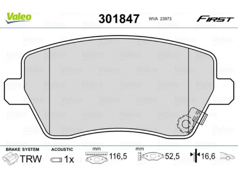 Criteries : Αριθμός WVA 23973, Βάρος [kg] 1,25, Επαφή προειδοποίησης φθοράς συμπεριλ. επαφής για ένδειξη φθοράς, Πάχος 2 [mm] 16,6, Πάχος [mm] 16,6, Πλάτος 2 [mm] 117, Πλάτος [mm] 117, Πλευρά τοποθέτησης μπροστινός άξονας, Πλήθος ενδείξεων φθοράς [ανά άξονα] 1, Στοιχεία ελέγχου ECE-R90, Συμπληρωματικό προϊόν/ πληροφορίες 2 χωρίς αντικραδασμικό έλασμα, Σύστημα φρένων TRW, Τρόπος λειτουργίας μηχανικό, Ύψος 2 [mm] 52,5, Υψος [mm] 52,5