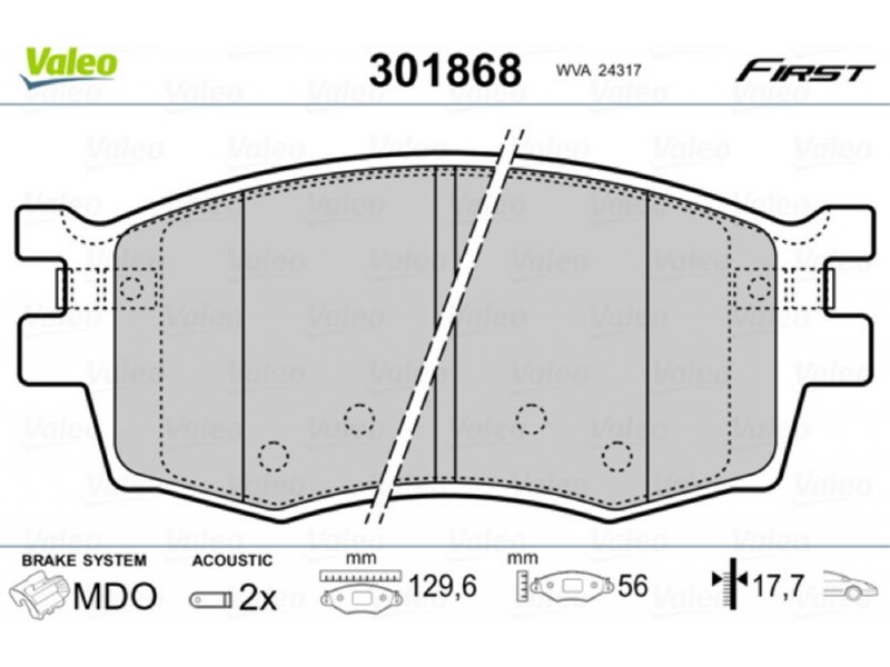 Criteries : Αριθμός WVA 24317, Βάρος [kg] 1,57, Επαφή προειδοποίησης φθοράς συμπεριλ. επαφής για ένδειξη φθοράς, Πάχος [mm] 17,7, Πλάτος [mm] 130, Πλευρά τοποθέτησης μπροστινός άξονας, Πλήθος ενδείξεων φθοράς [ανά άξονα] 2, Στοιχεία ελέγχου ECE-R90, Συμπληρωματικό προϊόν/ πληροφορίες 2 με αντικραδασμικό έλασμα, Σύστημα φρένων MANDO, Τρόπος λειτουργίας μηχανικό, Υψος [mm] 56