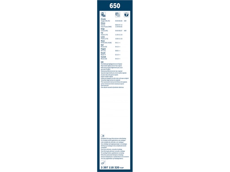 Criteries : Μήκος 1 [mm] 650, Μήκος 2 [mm] 650, Μονάδα ποσότητας Σετ, Παραλλαγή μάκτρων καθαριστήρα Μάκτρο καθαριστήρα χωρίς σπόιλερ, Πλευρά τοποθέτησης εμπρός