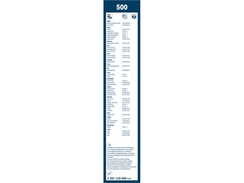 Criteries : Μήκος 1 [mm] 500, Μήκος 2 [mm] 500, Μονάδα ποσότητας Σετ, Παραλλαγή μάκτρων καθαριστήρα Μάκτρο καθαριστήρα χωρίς σπόιλερ, Πλευρά τοποθέτησης εμπρός