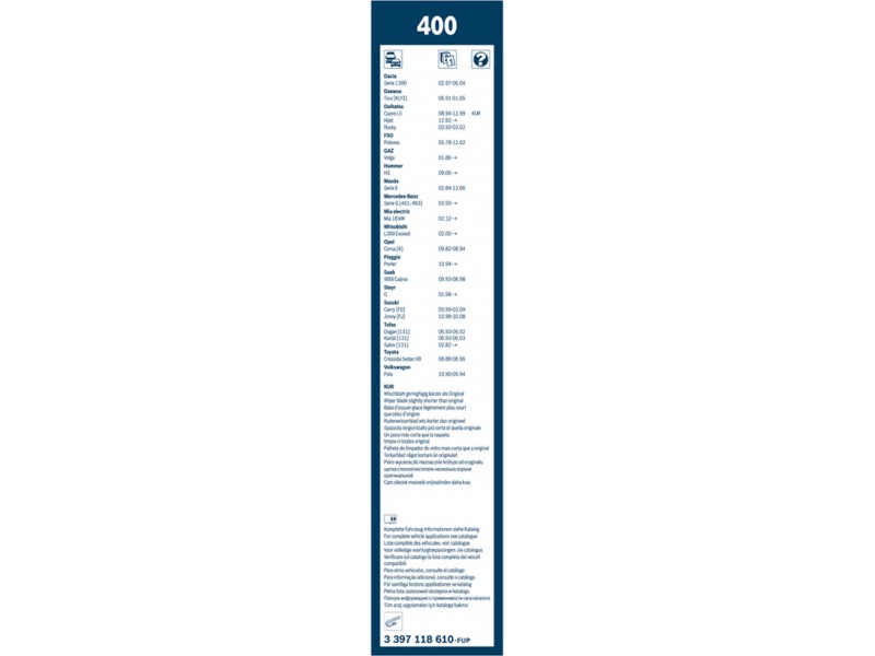 Criteries : Μήκος 1 [mm] 400, Μήκος 2 [mm] 400, Μονάδα ποσότητας Σετ, Παραλλαγή μάκτρων καθαριστήρα Μάκτρο καθαριστήρα χωρίς σπόιλερ, Πλευρά τοποθέτησης εμπρός