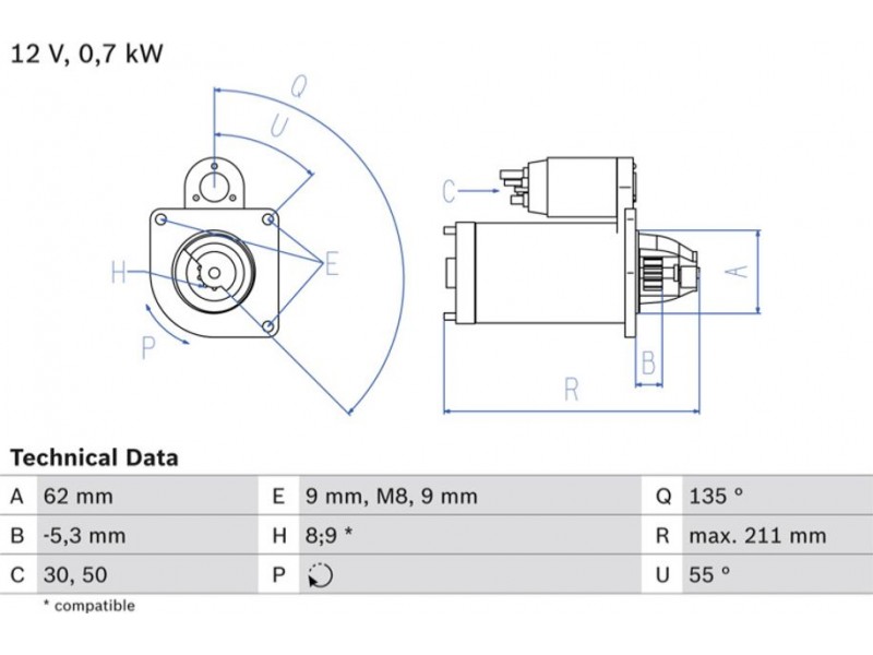 Criteries : Αριθμός δοντιών 8, Αριθμός δοντιών 9, Αρχική θέση γραναζιού [mm] -5,3, Γωνία Οπή στερέωσης [μοίρες] 55, Γωνία στήριξης [μοίρες] 55, Γωνία Στόμιο [μοίρες] 135, Διαμέτρος οπής 3 [mm] 9, Διάμετρος οπής [mm] 9, Διάμετρος φλάντζας [mm] 62, Διαστάσεις σπειρώματος 1 M8x1.25, Επαφή 30, Επαφή 50, Θέση/βαθμοί rechts, Ισχύς μίζας [kW] 0,7, Μήκος [mm] 211, Παλαιό εξάρτημα , Παραλλαγή μίζας αυτοέδραση, Πλήθος οπών με βόλτα 1, Πλήθος των οπών στερέωσης 2, Τάση [V] 12, Φορά περιστροφής Φορά περιστροφής προς τα δεξιά