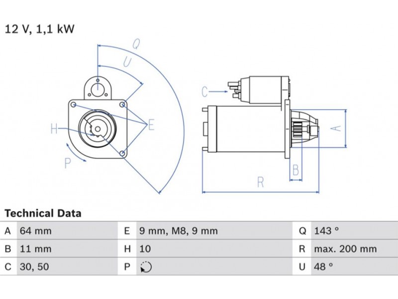 Criteries : Αριθμός δοντιών 10, Αρχική θέση γραναζιού [mm] 11, Γωνία Οπή στερέωσης [μοίρες] 48, Γωνία στήριξης [μοίρες] 48, Γωνία Στόμιο [μοίρες] 143, Διαμέτρος οπής 3 [mm] 9, Διάμετρος οπής [mm] 9, Διάμετρος φλάντζας [mm] 64, Διαστάσεις σπειρώματος 1 M8x1.25, Επαφή 30, Επαφή 50, Θέση/βαθμοί rechts, Ισχύς μίζας [kW] 1,1, Μήκος [mm] 200, Παλαιό εξάρτημα , Παραλλαγή μίζας αυτοέδραση, Πλήθος οπών με βόλτα 1, Πλήθος των οπών στερέωσης 2, Τάση [V] 12, Φορά περιστροφής Φορά περιστροφής προς τα δεξιά