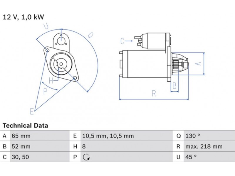 Criteries : Αριθμός δοντιών 8, Αρχική θέση γραναζιού [mm] 52, Γωνία Οπή στερέωσης [μοίρες] 45, Γωνία στήριξης [μοίρες] 45, Γωνία Στόμιο [μοίρες] 130, Διάμετρος οπής 2 [mm] 10,5, Διάμετρος οπής [mm] 10,5, Διάμετρος φλάντζας [mm] 65, Επαφή 30, Επαφή 50, Θέση/βαθμοί links, Ισχύς μίζας [kW] 1, Μήκος [mm] 218, Παλαιό εξάρτημα , Παραλλαγή μίζας αυτοέδραση, Πλήθος οπών με βόλτα 0, Πλήθος των οπών στερέωσης 2, Τάση [V] 12, Φορά περιστροφής Φορά περιστρ. αντίθετα προς τη φορά των δεικτών του ρολογιού