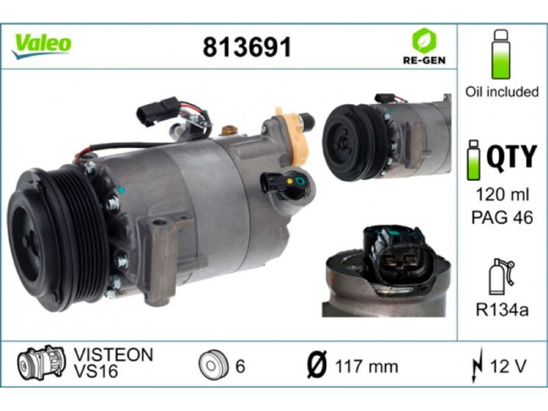 Criteries : ID συμπιεστή VS16, Αριθμός κυλίνδρων R 134a, Βάρος [kg] 6,61, Διάμ. τροχαλίας ιμάντα [mm] 117, Λάδι συμπιεστή PAG 46, Παλαιό εξάρτημα , Περιορισμός κατασκευαστή VISTEON, Πλήθος εγκοπών 6, Συμπληρωματικό προϊόν/ πληροφορίες 2 με λάδι συμπιεστή PAG, Τάση [V] 12, Χωρητικότητα λαδιού [ml] 120