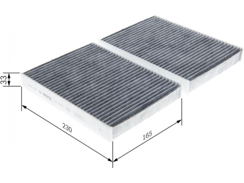 Criteries : Έκδοση εξαιρετ. απόδοσης με ενεργό άνθρακα (αρ. προϊόντος) 0986628571, Μήκος [mm] 230, Παραλλαγή φίλτρου φίλτρο ενεργού άνθρακα, Παραλλαγή φίλτρου Φίλτρο σωματιδίων, Πλάτος [mm] 165, Ποσότητα 2, Υψος [mm] 30