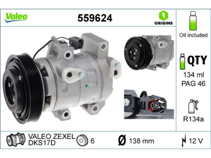 Criteries : ID συμπιεστή DKS17D, Αριθμός κυλίνδρων R 134a, Βάρος [kg] 7,47, Διάμ. τροχαλίας ιμάντα [mm] 138, Λάδι συμπιεστή PAG 46, Νέο εξάρτημα , Περιορισμός κατασκευαστή VALEO ZEXEL, Πλήθος εγκοπών 6, Συμπληρωματικό προϊόν/ πληροφορίες 2 με λάδι συμπιεστή PAG, Τάση [V] 12, Χωρητικότητα λαδιού [ml] 134