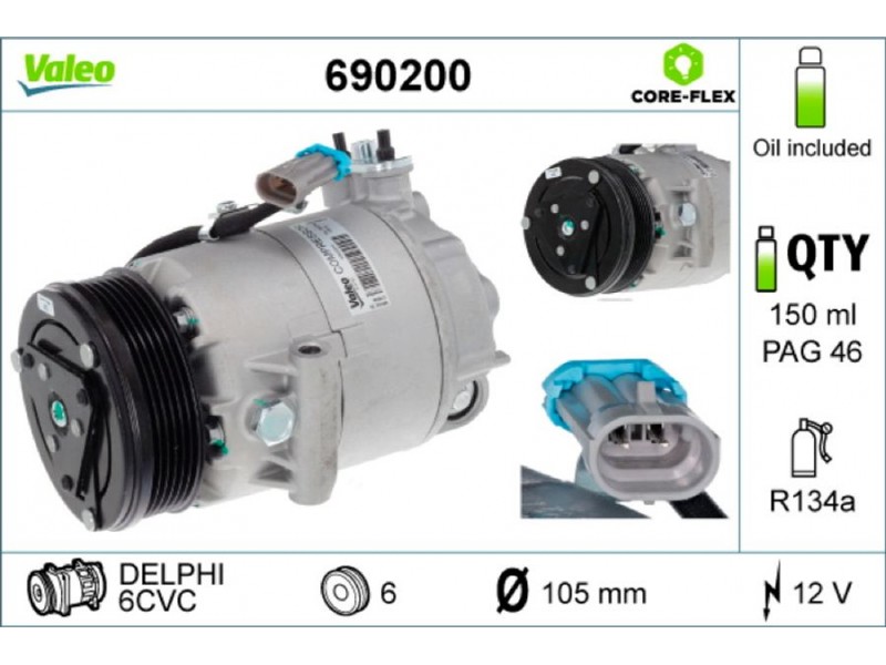 Criteries : ID συμπιεστή 6CVC, Αριθμός κυλίνδρων R 134a, Βάρος [kg] 5,81, Διάμ. τροχαλίας ιμάντα [mm] 105, Κυβισμός κομπρεσέρ [ccm] 133, Λάδι συμπιεστή PAG 46, Νέο εξάρτημα , Περιορισμός κατασκευαστή DELPHI, Πλήθος εγκοπών 6, Συμπληρωματικό προϊόν/ πληροφορίες 2 με λάδι συμπιεστή PAG, Τάση [V] 12, Χωρητικότητα λαδιού [ml] 150
