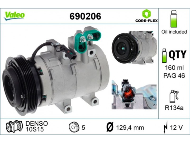 Criteries : ID συμπιεστή 10S15, Αριθμός κυλίνδρων R 134a, Βάρος [kg] 7,39, Διάμ. τροχαλίας ιμάντα [mm] 129, Κυβισμός κομπρεσέρ [ccm] 177, Λάδι συμπιεστή PAG 46, Νέο εξάρτημα , Περιορισμός κατασκευαστή DENSO, Πλήθος εγκοπών 5, Συμπληρωματικό προϊόν/ πληροφορίες 2 με λάδι συμπιεστή PAG, Τάση [V] 12, Χωρητικότητα λαδιού [ml] 160