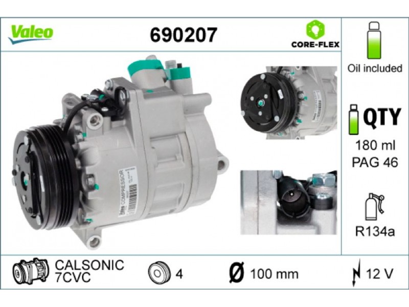 Criteries : ID συμπιεστή 7CVC, Αριθμός κυλίνδρων R 134a, Βάρος [kg] 6,9, Διάμ. τροχαλίας ιμάντα [mm] 100, Κυβισμός κομπρεσέρ [ccm] 171, Λάδι συμπιεστή PAG 46, Νέο εξάρτημα , Περιορισμός κατασκευαστή CALSONIC, Πλήθος εγκοπών 4, Συμπληρωματικό προϊόν/ πληροφορίες 2 με λάδι συμπιεστή PAG, Τάση [V] 12, Χωρητικότητα λαδιού [ml] 180