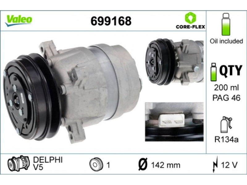 Criteries : ID συμπιεστή V5, Αριθμός κυλίνδρων R 134a, Βάρος [kg] 7,3, Διάμ. τροχαλίας ιμάντα [mm] 142, Κυβισμός κομπρεσέρ [ccm] 160, Λάδι συμπιεστή PAG 46, Νέο εξάρτημα , Περιορισμός κατασκευαστή DELPHI, Πλήθος εγκοπών 1, Συμπληρωματικό προϊόν/ πληροφορίες 2 με λάδι συμπιεστή PAG, Τάση [V] 12, Χωρητικότητα λαδιού [ml] 200