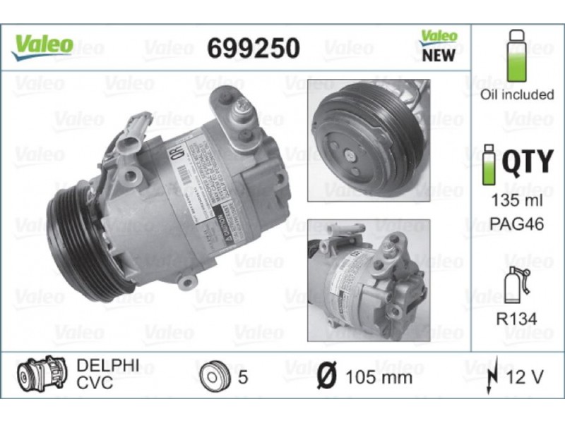 Criteries : ID συμπιεστή CVC917, Αριθμός κυλίνδρων R 134a, Βάρος [kg] 5,985, Διάμ. τροχαλίας ιμάντα [mm] 105, Κυβισμός κομπρεσέρ [ccm] 121, Λάδι συμπιεστή PAG 46, Νέο εξάρτημα , Περιορισμός κατασκευαστή DELPHI, Πλήθος εγκοπών 5, Συμπληρωματικό προϊόν/ πληροφορίες 2 με λάδι συμπιεστή PAG, Τάση [V] 12, Χωρητικότητα λαδιού [ml] 135