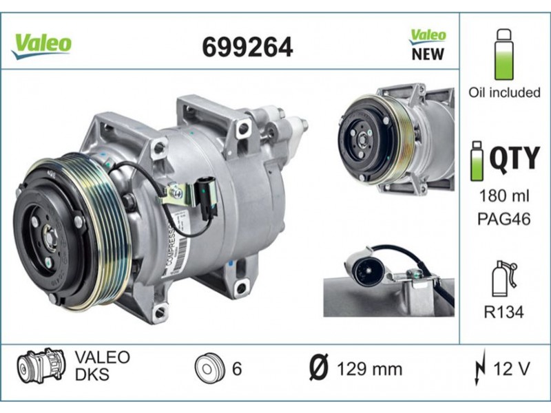 Criteries : ID συμπιεστή DKS17D, Αριθμός κυλίνδρων R 134a, Βάρος [kg] 7, Διάμ. τροχαλίας ιμάντα [mm] 134, Λάδι συμπιεστή PAG 46, Νέο εξάρτημα , Περιορισμός κατασκευαστή VALEO ZEXEL, Πλήθος εγκοπών 6, Συμπληρωματικό προϊόν/ πληροφορίες 2 με λάδι συμπιεστή PAG, Τάση [V] 12, Χωρητικότητα λαδιού [ml] 130