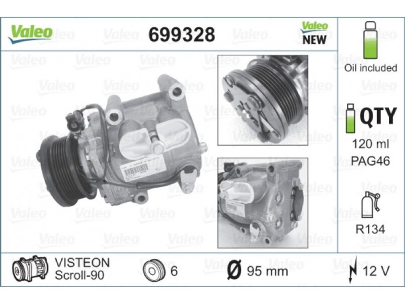 Criteries : ID συμπιεστή Scroll-90, Αριθμός κυλίνδρων R 134a, Βάρος [kg] 7,2, Διάμ. τροχαλίας ιμάντα [mm] 95, Λάδι συμπιεστή PAG 46, Νέο εξάρτημα , Περιορισμός κατασκευαστή VISTEON, Πλήθος εγκοπών 6, Συμπληρωματικό προϊόν/ πληροφορίες 2 με λάδι συμπιεστή PAG, Τάση [V] 12, Χωρητικότητα λαδιού [ml] 120