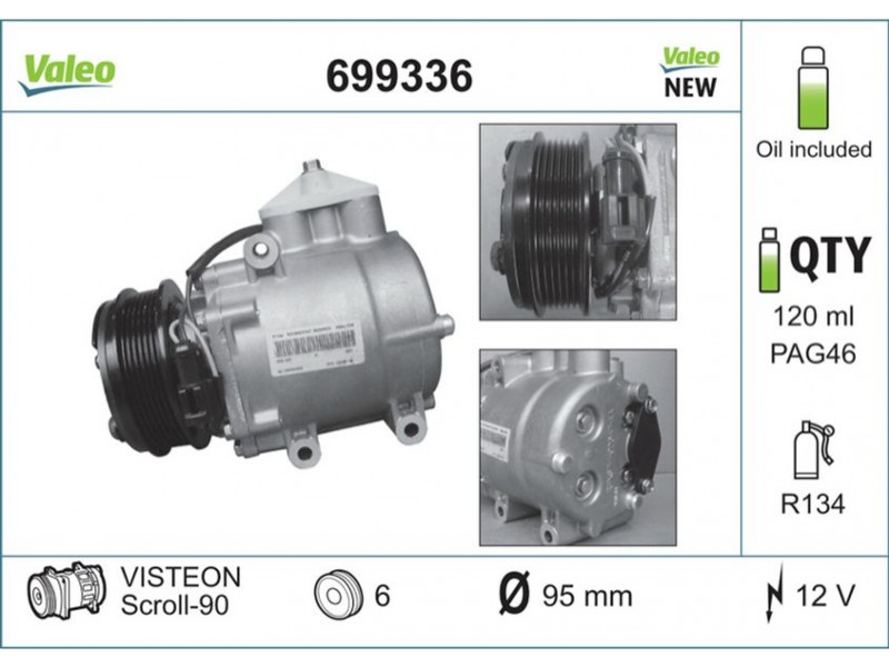 Criteries : ID συμπιεστή Scroll-90, Αριθμός κυλίνδρων R 134a, Βάρος [kg] 7,46, Διάμ. τροχαλίας ιμάντα [mm] 95, Λάδι συμπιεστή PAG 46, Νέο εξάρτημα , Περιορισμός κατασκευαστή VISTEON, Πλήθος εγκοπών 6, Συμπληρωματικό προϊόν/ πληροφορίες 2 με λάδι συμπιεστή PAG, Τάση [V] 12, Χωρητικότητα λαδιού [ml] 120