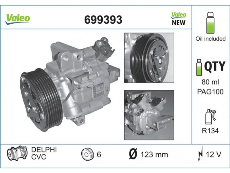 Criteries : ID συμπιεστή DKV06R, Αριθμός κυλίνδρων R 134a, Βάρος [kg] 3,73, Διάμ. τροχαλίας ιμάντα [mm] 123, Λάδι συμπιεστή PAG 100, Νέο εξάρτημα , Περιορισμός κατασκευαστή DELPHI, Πλήθος εγκοπών 6, Συμπληρωματικό προϊόν/ πληροφορίες 2 με λάδι συμπιεστή PAG, Τάση [V] 12, Χωρητικότητα λαδιού [ml] 80