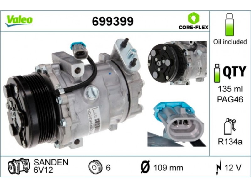 Criteries : ID συμπιεστή 6V12, Αριθμός κυλίνδρων R 134a, Βάρος [kg] 6,07, Διάμ. τροχαλίας ιμάντα [mm] 109, Κυβισμός κομπρεσέρ [ccm] 121, Λάδι συμπιεστή PAG 46, Νέο εξάρτημα , Περιορισμός κατασκευαστή SANDEN, Πλήθος εγκοπών 6, Συμπληρωματικό προϊόν/ πληροφορίες 2 με λάδι συμπιεστή PAG, Τάση [V] 12, Χωρητικότητα λαδιού [ml] 135