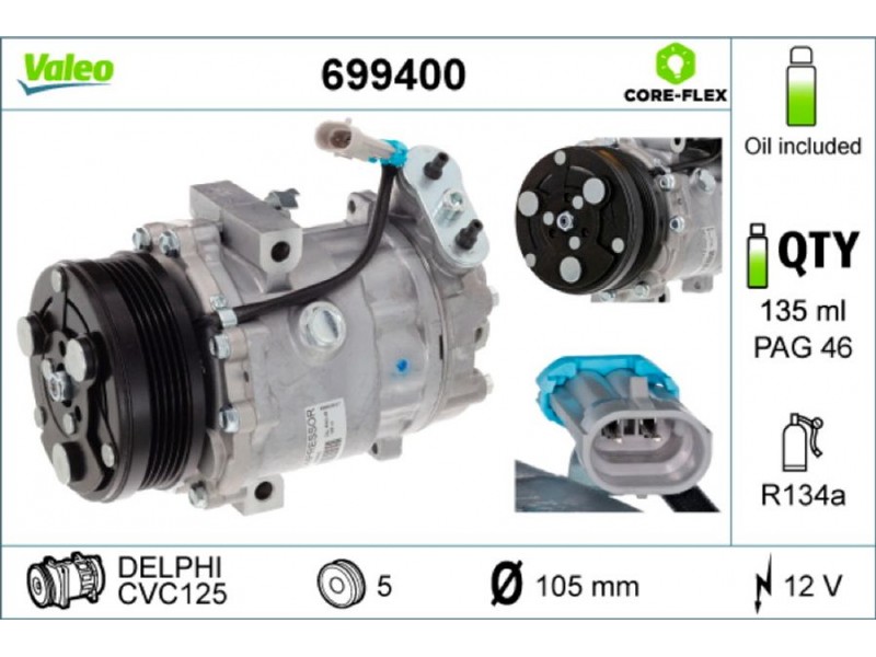 Criteries : ID συμπιεστή CVC125, Αριθμός κυλίνδρων R 134a, Βάρος [kg] 6,13, Διάμ. τροχαλίας ιμάντα [mm] 105, Κυβισμός κομπρεσέρ [ccm] 121, Λάδι συμπιεστή PAG 46, Νέο εξάρτημα , Περιορισμός κατασκευαστή DELPHI, Πλήθος εγκοπών 5, Συμπληρωματικό προϊόν/ πληροφορίες 2 με λάδι συμπιεστή PAG, Τάση [V] 12, Χωρητικότητα λαδιού [ml] 135