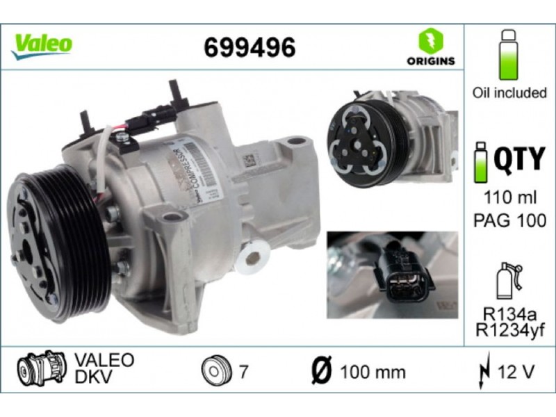 Criteries : ID συμπιεστή DKV, Αριθμός κυλίνδρων R 1234yf, Βάρος [kg] 4,21, Διάμ. τροχαλίας ιμάντα [mm] 100, Λάδι συμπιεστή PAG 100, Νέο εξάρτημα , Περιορισμός κατασκευαστή VALEO, Πλήθος εγκοπών 7, Συμπληρωματικό προϊόν/ πληροφορίες 2 με λάδι συμπιεστή PAG, Τάση [V] 12, Χωρητικότητα λαδιού [ml] 110