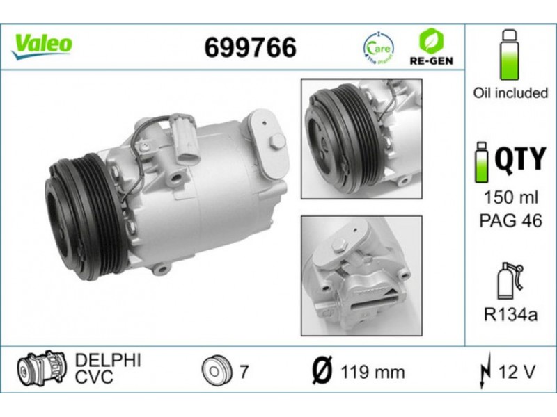 Criteries : ID συμπιεστή CVC, Αριθμός κυλίνδρων R 134a, Βάρος [kg] 5,89, Διάμ. τροχαλίας ιμάντα [mm] 119, Λάδι συμπιεστή PAG 46, Παλαιό εξάρτημα , Περιορισμός κατασκευαστή DELPHI, Πλήθος εγκοπών 7, Συμπληρωματικό προϊόν/ πληροφορίες 2 με λάδι συμπιεστή PAG, Τάση [V] 12, Χωρητικότητα λαδιού [ml] 150