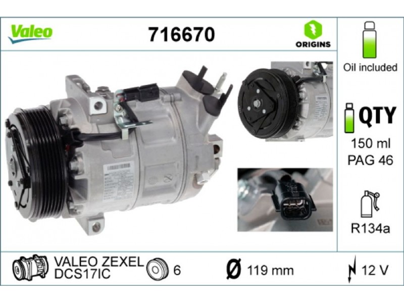 Criteries : ID συμπιεστή DCS17IC, Αριθμός κυλίνδρων R 134a, Βάρος [kg] 7,29, Διάμ. τροχαλίας ιμάντα [mm] 119, Λάδι συμπιεστή PAG 46, Νέο εξάρτημα , Περιορισμός κατασκευαστή VALEO ZEXEL, Πλήθος εγκοπών 6, Συμπληρωματικό προϊόν/ πληροφορίες 2 με λάδι συμπιεστή PAG, Τάση [V] 12, Χωρητικότητα λαδιού [ml] 150