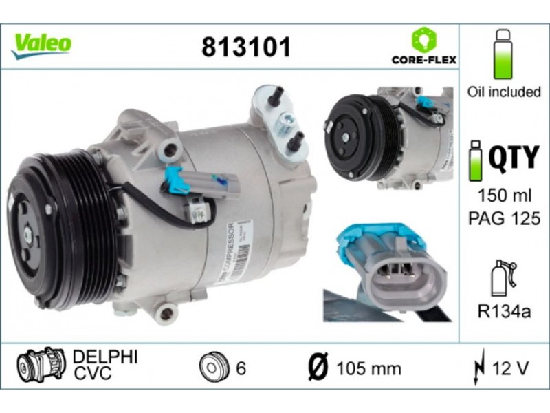 Criteries : ID συμπιεστή CVC, Αριθμός κυλίνδρων R 134a, Βάρος [kg] 5,98, Διάμ. τροχαλίας ιμάντα [mm] 105, Κυβισμός κομπρεσέρ [ccm] 133, Λάδι συμπιεστή PAG 125, Νέο εξάρτημα , Περιορισμός κατασκευαστή DELPHI, Πλήθος εγκοπών 6, Συμπληρωματικό προϊόν/ πληροφορίες 2 με λάδι συμπιεστή PAG, Τάση [V] 12, Χωρητικότητα λαδιού [ml] 150
