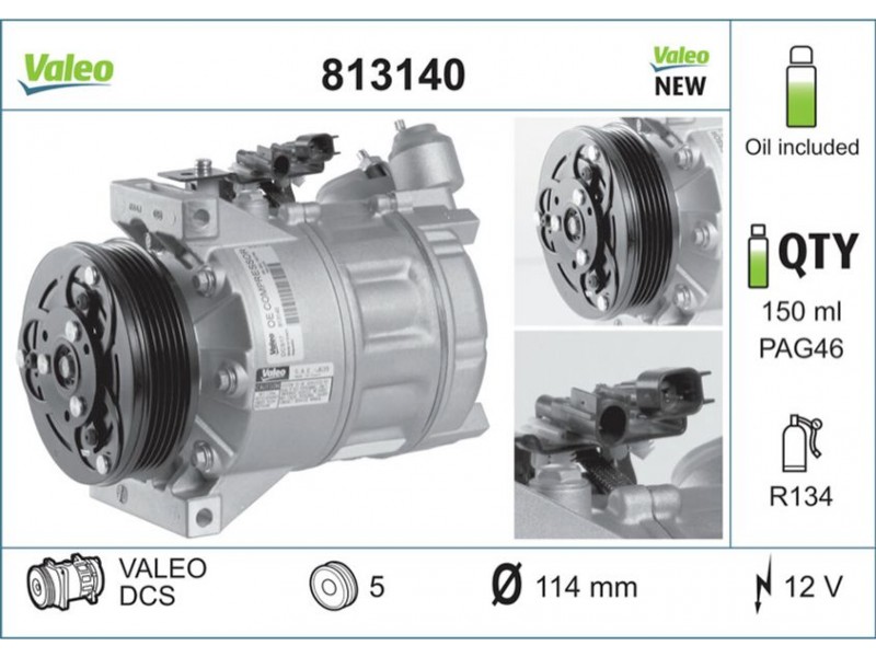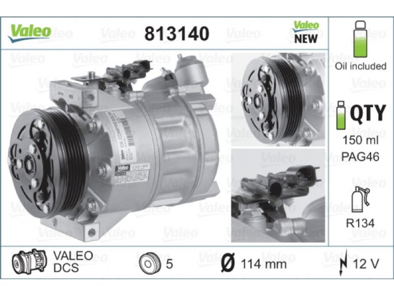 Criteries : ID συμπιεστή DCS, Αριθμός κυλίνδρων R 134a, Βάρος [kg] 6,77, Διάμ. τροχαλίας ιμάντα [mm] 114, Λάδι συμπιεστή PAG 46, Νέο εξάρτημα , Περιορισμός κατασκευαστή VALEO, Πλήθος εγκοπών 5, Συμπληρωματικό προϊόν/ πληροφορίες 2 με λάδι συμπιεστή PAG, Τάση [V] 12, Χωρητικότητα λαδιού [ml] 150
