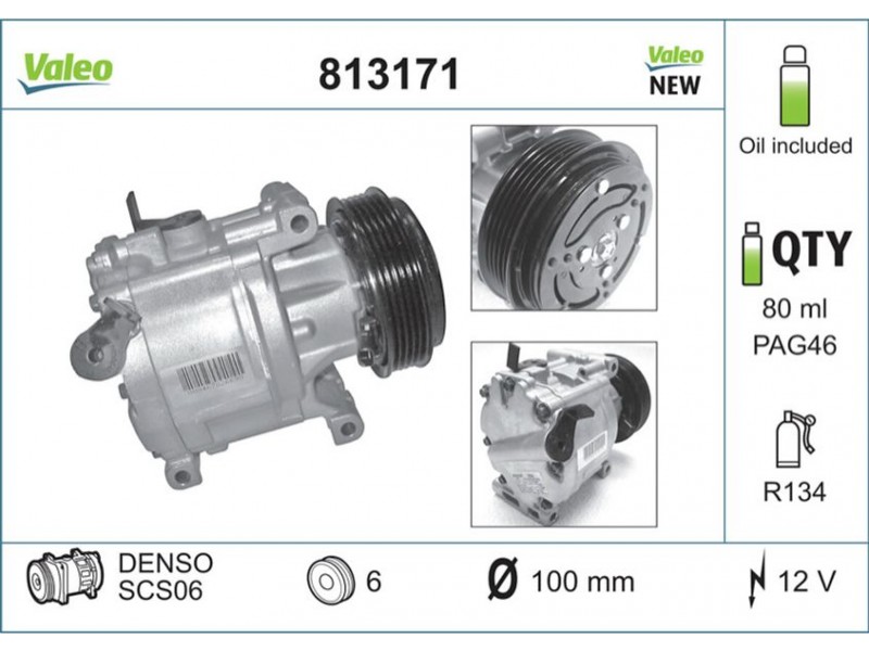 Criteries : ID συμπιεστή SCS06, Αριθμός κυλίνδρων R 134a, Βάρος [kg] 4,522, Διάμ. τροχαλίας ιμάντα [mm] 100, Λάδι συμπιεστή PAG 46, Νέο εξάρτημα , Περιορισμός κατασκευαστή DENSO, Πλήθος εγκοπών 6, Συμπληρωματικό προϊόν/ πληροφορίες 2 με λάδι συμπιεστή PAG, Τάση [V] 12, Χωρητικότητα λαδιού [ml] 80