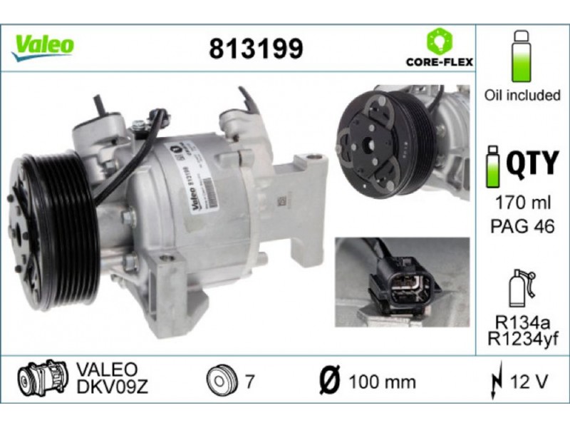 Criteries : ID συμπιεστή DKV09Z, Αριθμός κυλίνδρων R 1234yf, Αριθμός κυλίνδρων R 134a, Βάρος [kg] 4,28, Διάμ. τροχαλίας ιμάντα [mm] 100, Λάδι συμπιεστή PAG 100, Νέο εξάρτημα , Περιορισμός κατασκευαστή VALEO, Πλήθος εγκοπών 7, Συμπληρωματικό προϊόν/ πληροφορίες 2 με λάδι συμπιεστή PAG, Τάση [V] 12, Χωρητικότητα λαδιού [ml] 170