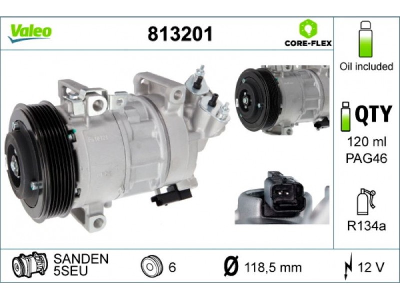 Criteries : ID συμπιεστή 5SEU, Αριθμός κυλίνδρων R 134a, Βάρος [kg] 5,22, Διάμ. τροχαλίας ιμάντα [mm] 119, Κυβισμός κομπρεσέρ [ccm] 123, Λάδι συμπιεστή PAG 46, Νέο εξάρτημα , Περιορισμός κατασκευαστή SANDEN, Πλήθος εγκοπών 6, Συμπληρωματικό προϊόν/ πληροφορίες 2 με λάδι συμπιεστή PAG, Τάση [V] 12, Χωρητικότητα λαδιού [ml] 120
