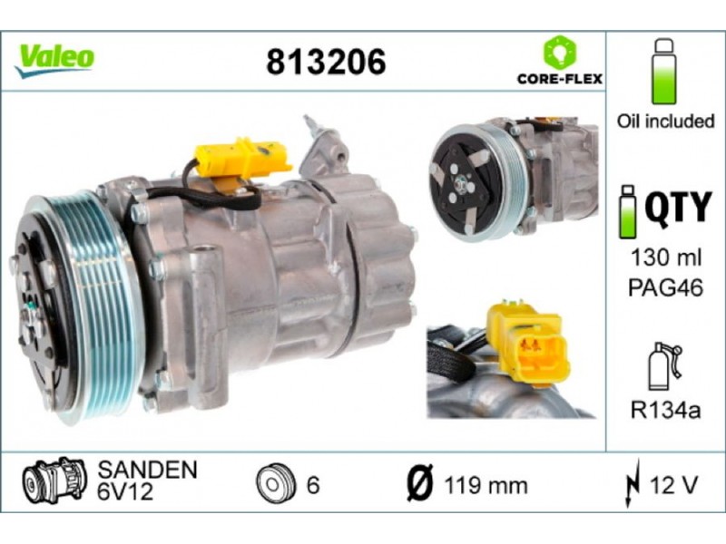 Criteries : ID συμπιεστή 6V12, Αριθμός κυλίνδρων R 134a, Βάρος [kg] 6,41, Διάμ. τροχαλίας ιμάντα [mm] 119, Κυβισμός κομπρεσέρ [ccm] 121, Λάδι συμπιεστή PAG 46, Νέο εξάρτημα , Περιορισμός κατασκευαστή SANDEN, Πλήθος εγκοπών 6, Συμπληρωματικό προϊόν/ πληροφορίες 2 με λάδι συμπιεστή PAG, Τάση [V] 12, Χωρητικότητα λαδιού [ml] 130