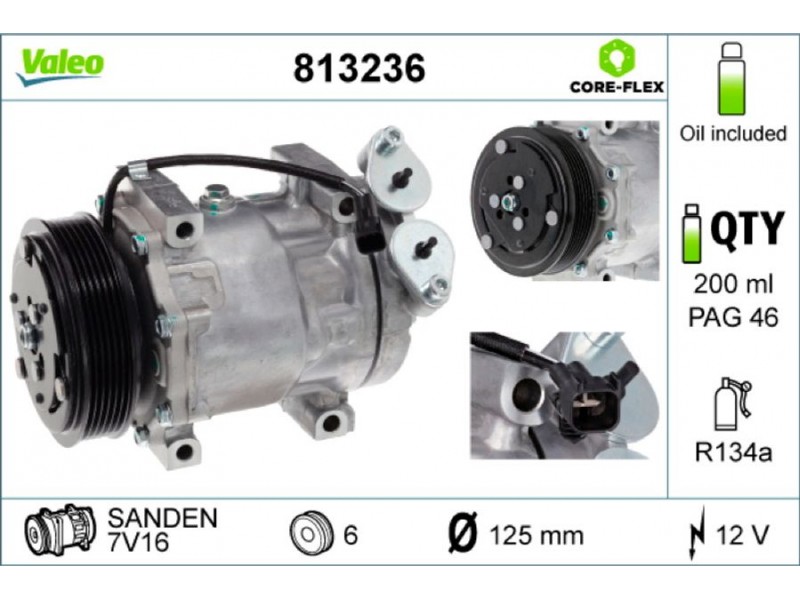 Criteries : ID συμπιεστή 7V16, Αριθμός κυλίνδρων R 134a, Βάρος [kg] 7,11, Διάμ. τροχαλίας ιμάντα [mm] 125, Κυβισμός κομπρεσέρ [ccm] 154, Λάδι συμπιεστή PAG 46, Νέο εξάρτημα , Περιορισμός κατασκευαστή SANDEN, Πλήθος εγκοπών 6, Συμπληρωματικό προϊόν/ πληροφορίες 2 με λάδι συμπιεστή PAG, Τάση [V] 12, Χωρητικότητα λαδιού [ml] 200