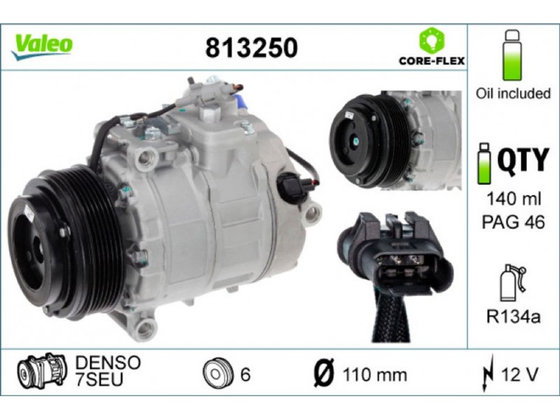 Criteries : ID συμπιεστή 7SEU, Αριθμός κυλίνδρων R 134a, Βάρος [kg] 7,23, Διάμ. τροχαλίας ιμάντα [mm] 110, Κυβισμός κομπρεσέρ [ccm] 171, Λάδι συμπιεστή PAG 46, Νέο εξάρτημα , Περιορισμός κατασκευαστή DENSO, Πλήθος εγκοπών 6, Συμπληρωματικό προϊόν/ πληροφορίες 2 με λάδι συμπιεστή PAG, Τάση [V] 12, Χωρητικότητα λαδιού [ml] 140