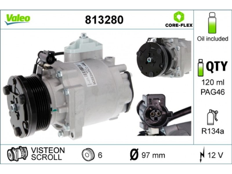 Criteries : Αριθμός κυλίνδρων R 134a, Βάρος [kg] 6,8, Διάμ. τροχαλίας ιμάντα [mm] 97, Λάδι συμπιεστή PAG 46, Νέο εξάρτημα , Περιορισμός κατασκευαστή VISTEON, Πλήθος εγκοπών 6, Συμπληρωματικό προϊόν/ πληροφορίες 2 με λάδι συμπιεστή PAG, Τάση [V] 12, Τεχνολογία συμπιεστή κλιματιστικού Scroll, Χωρητικότητα λαδιού [ml] 120