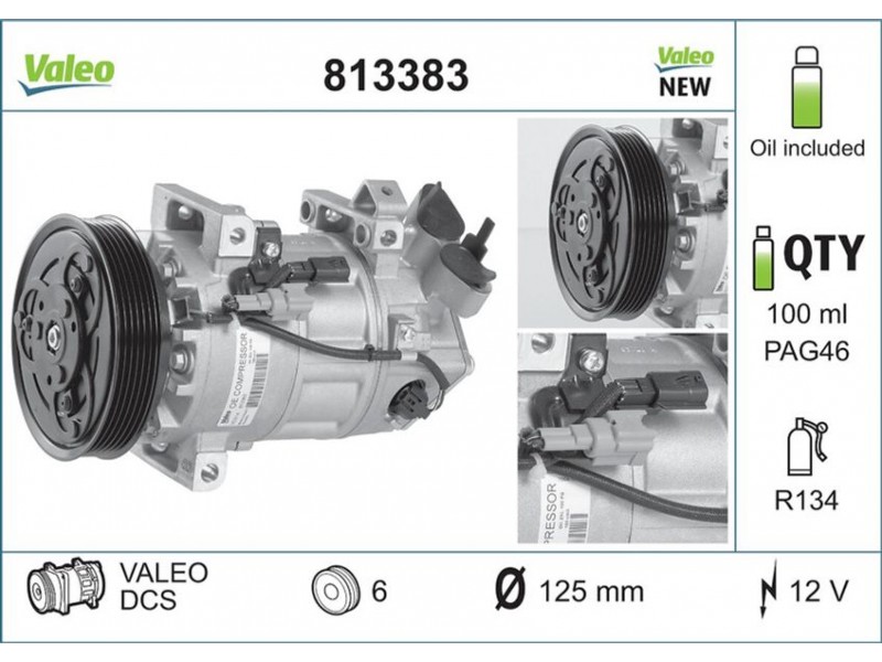 Criteries : ID συμπιεστή DCS, Αριθμός κυλίνδρων R 134a, Βάρος [kg] 6,48, Διάμ. τροχαλίας ιμάντα [mm] 125, Λάδι συμπιεστή PAG 46, Νέο εξάρτημα , Περιορισμός κατασκευαστή VALEO, Πλήθος εγκοπών 6, Συμπληρωματικό προϊόν/ πληροφορίες 2 με λάδι συμπιεστή PAG, Τάση [V] 12, Χωρητικότητα λαδιού [ml] 100