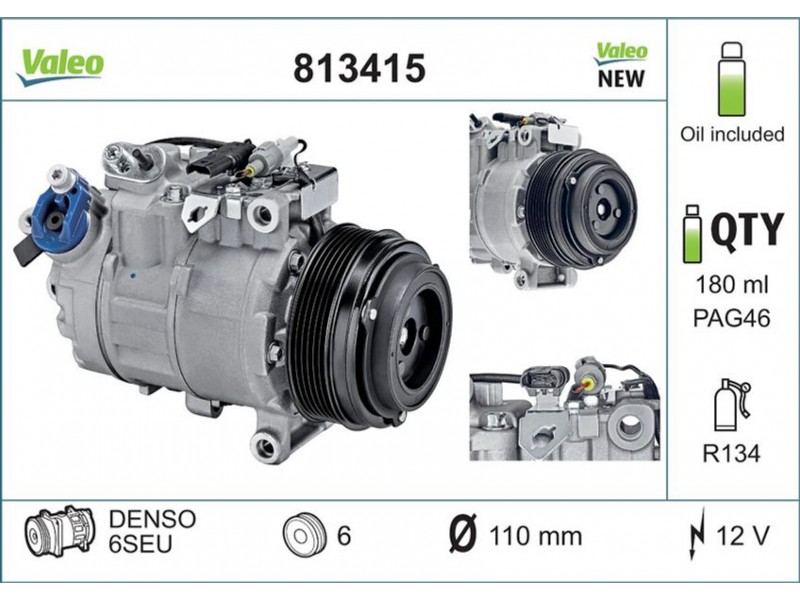 Criteries : ID συμπιεστή 6SEU14, Αριθμός κυλίνδρων R 134a, Βάρος [kg] 6,52, Διάμ. τροχαλίας ιμάντα [mm] 110, Κυβισμός κομπρεσέρ [ccm] 133, Λάδι συμπιεστή PAG 46, Νέο εξάρτημα , Περιορισμός κατασκευαστή DENSO, Πλήθος εγκοπών 6, Συμπληρωματικό προϊόν/ πληροφορίες 2 με λάδι συμπιεστή PAG, Τάση [V] 12, Χωρητικότητα λαδιού [ml] 180