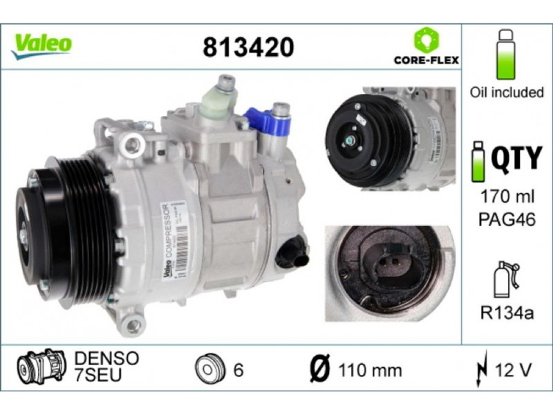 Criteries : ID συμπιεστή 7SEU, Αριθμός κυλίνδρων R 134a, Βάρος [kg] 6,61, Διάμ. τροχαλίας ιμάντα [mm] 110, Κυβισμός κομπρεσέρ [ccm] 171, Λάδι συμπιεστή PAG 46, Νέο εξάρτημα , Περιορισμός κατασκευαστή DENSO, Πλήθος εγκοπών 6, Συμπληρωματικό προϊόν/ πληροφορίες 2 με λάδι συμπιεστή PAG, Τάση [V] 12, Χωρητικότητα λαδιού [ml] 170