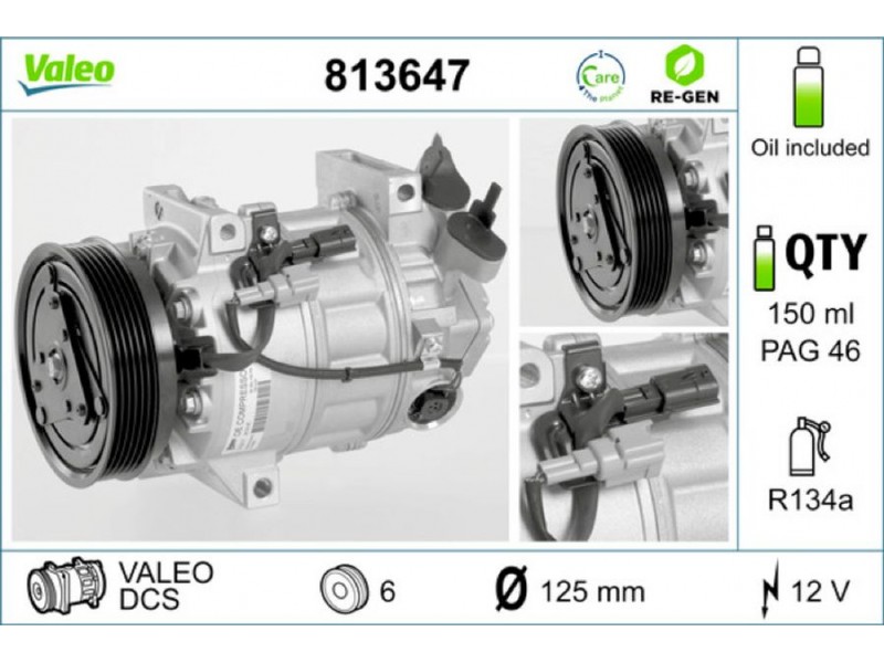 Criteries : ID συμπιεστή DCS, Αριθμός κυλίνδρων R 134a, Βάρος [kg] 7,26, Διάμ. τροχαλίας ιμάντα [mm] 125, Λάδι συμπιεστή PAG 46, Παλαιό εξάρτημα , Περιορισμός κατασκευαστή VALEO, Πλήθος εγκοπών 6, Συμπληρωματικό προϊόν/ πληροφορίες 2 με λάδι συμπιεστή PAG, Τάση [V] 12, Χωρητικότητα λαδιού [ml] 150